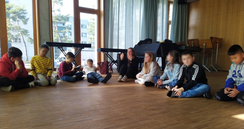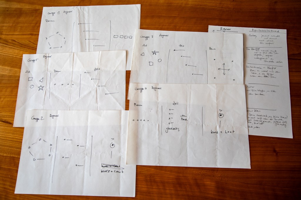 The task was to perform a sound and a movement sequence in their group. Without any instruments at hand, the sounds were limited to voice and body sounds, such a humming, speaking words, clapping stamping the feet etc.